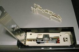 ![]() | The stylus unit can be removed for cleaning or replacement, via a cover on the left. The fact that this is easy to open, and not hidden away from the casual user, suggests that such actions were needed relatively frequently... The stylus compartment opened, with the stylus itself laying on top of the machine. Drop it in, close the lid, and you're ready to go again. |