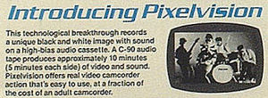 | The idea was to produce a camcorder which was cheap and simple enough to be used by children. "Normal" camcorders retailed at the time for around £1000, so the PXL was about one-eighth of the cost. The marketing stressed the simplicity of the system, and the fun of being able to make your own films. They'd have to be quite short films, however, as the machine could only record about five minutes of black-and-white video on each side of a C90 cassette. | ![]() |